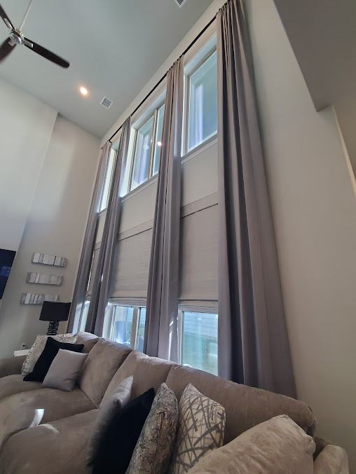 Soften the look of tall, two-story windows common in Prosper homes.. Soft treatments come in many textures, patterns, and colors. We offer thousands of fabrics to match your “Texas Modern” or Farmhouse aesthetic.